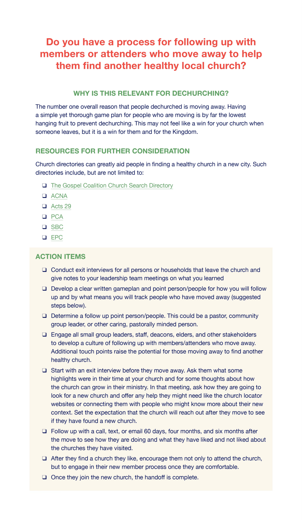 The Toolkit has two parts. The first part is a 20 point checklist to audit how your organization is doing on key areas that impact dechurching. The second part consists of one worksheet for each of the 20 point checklist that tell you why that area is relevant to dechurching, suggestions for additional reading or listening, and a step by step workflow for how to improve your organization in this area.
