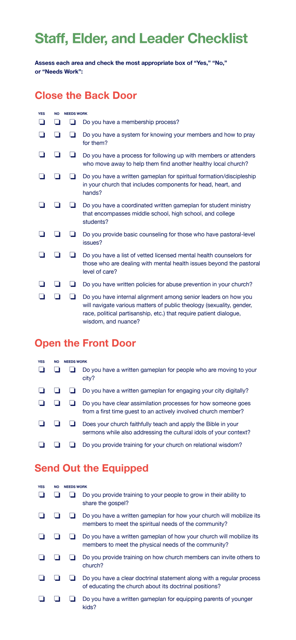 The Rechurching Toolkit is to be used in conjunction with the book The Great Dechurching by Michael Graham and Jim Davis. It exists for pastors, church leaders, and leaders of Christian institutions who want to close the back door, open the front door, and send out their people better equipped.